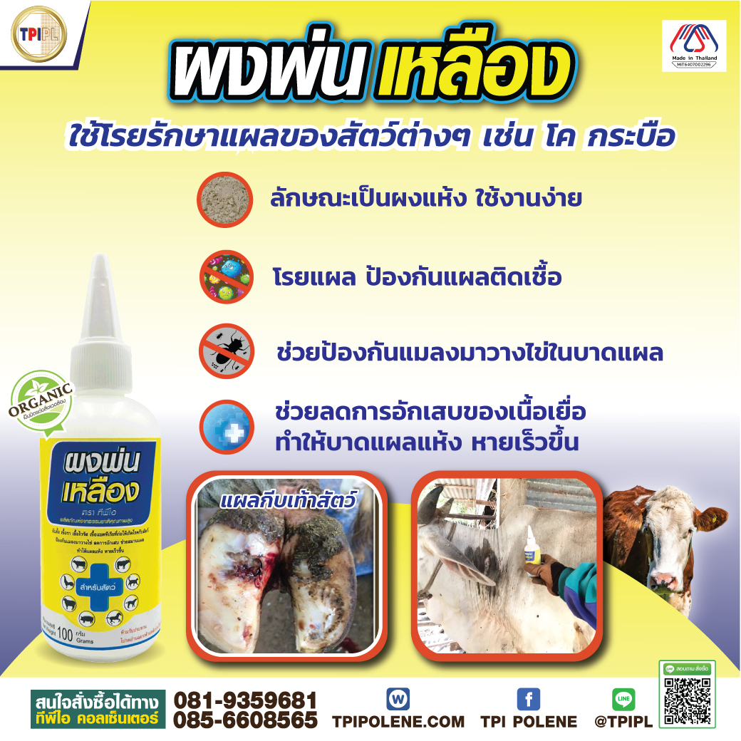 ผงพ่นเหลือง ใช้โรยรักษาแผลของสัตว์ต่างๆ