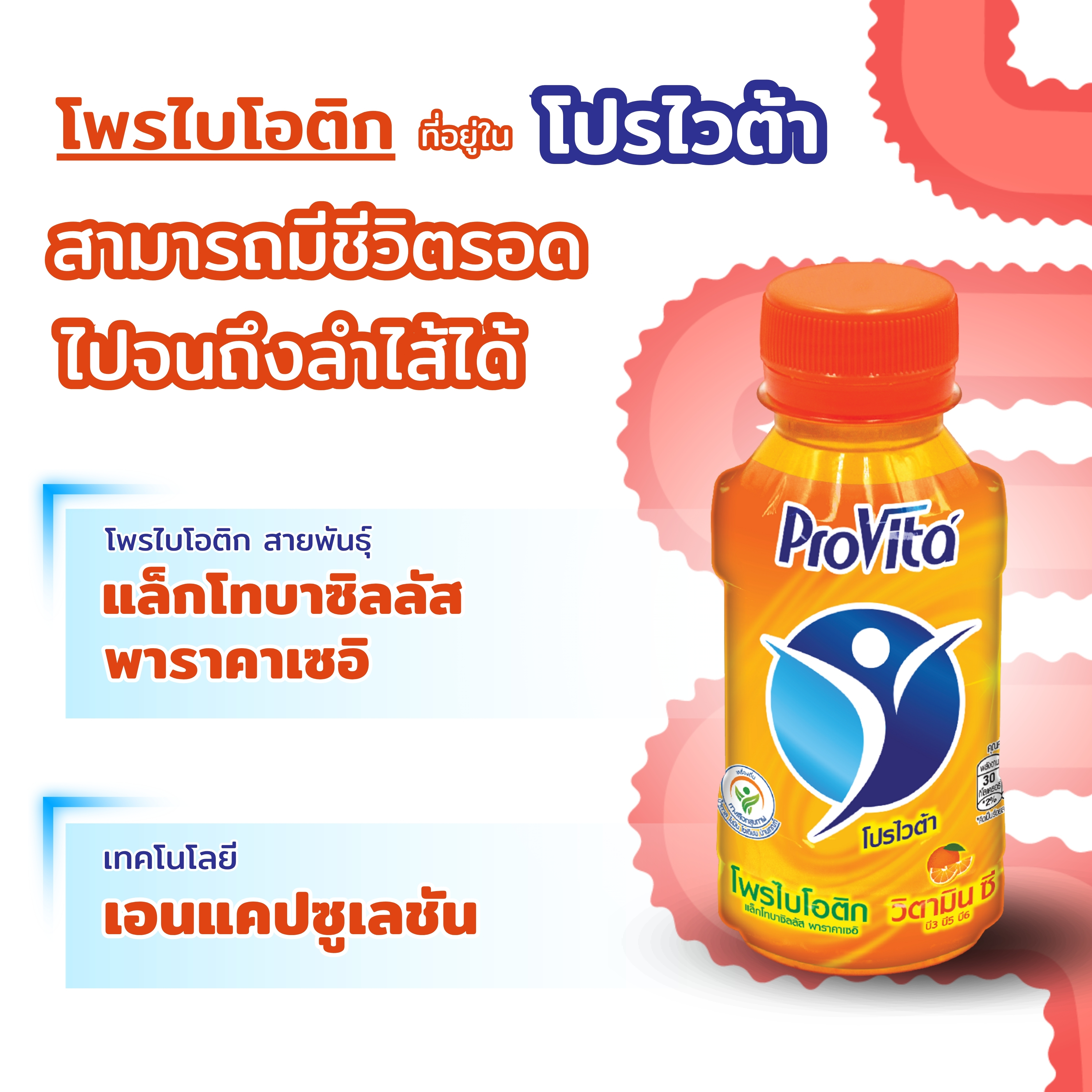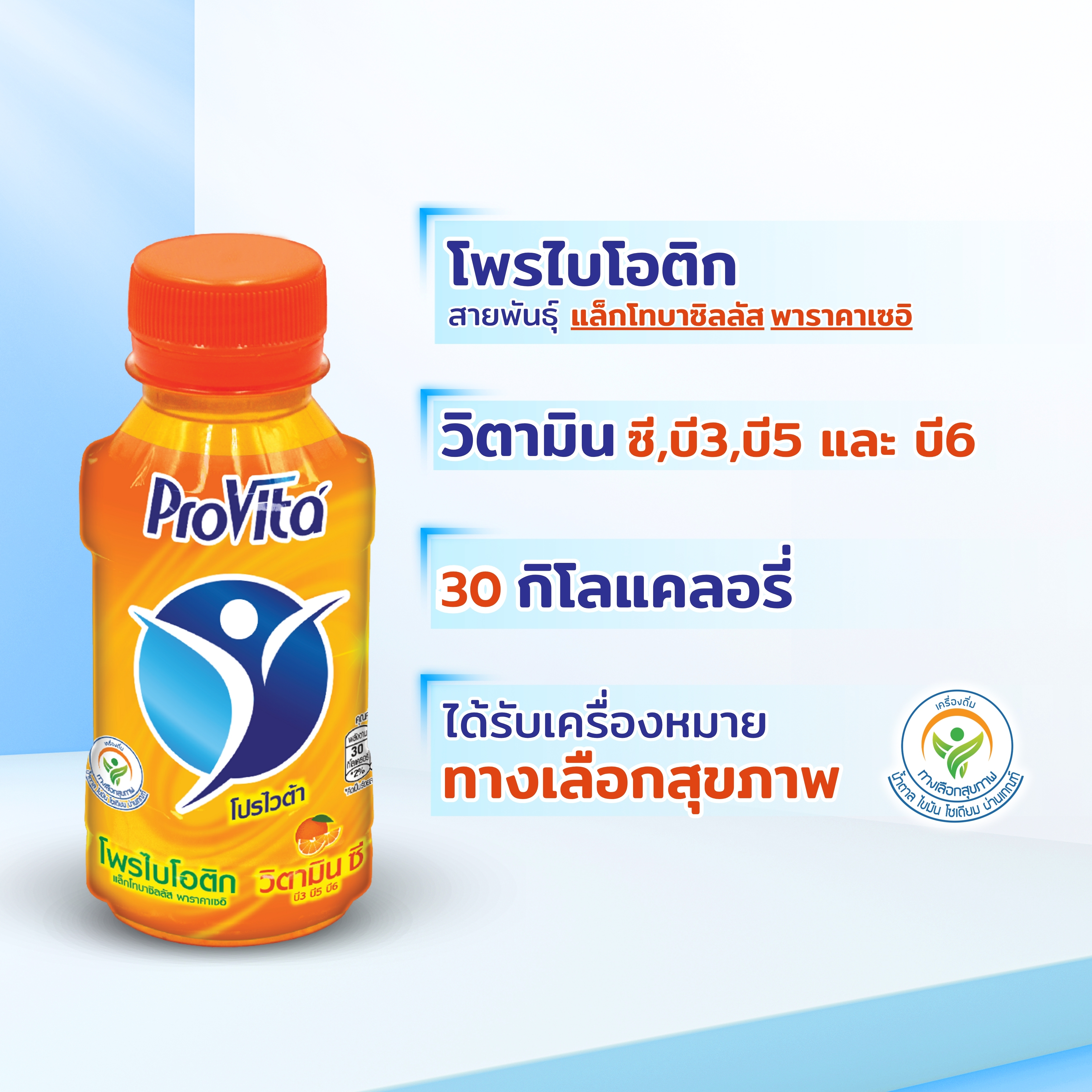 มั่นใจได้ด้วย #โปรไวต้า เครื่องดื่มโพรไบโอติก ผสมวิตามิน ซี บี3 บี5 บี6 รสส้ม