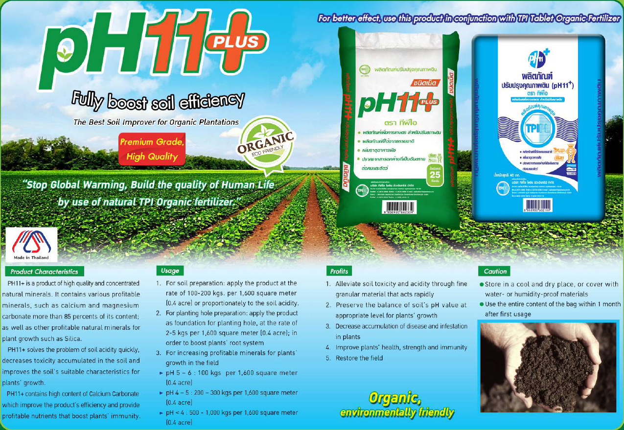 PH11+ is a product of high quality and concentrated natural minerals. It contains various profitable minerals, such as calcium and magnesium carbonate more than 85 percent of its content; as well as other profitable natural minerals for plant growth such as Silica. PH11+ solves the problem of soil acidity quickly, decreases toxicity accumulated in the soil and improves the soil's suitable characteristics for plants' growth. PH11+ contains high content of Calcium Carbonate I* which improve the product's efficiency and provide profitable nutrients that boost plants' immunity.