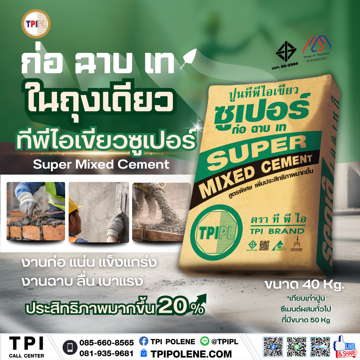 ปูนทีพีไอเขียวซูเปอร์ ขนาด 40 กก. | TPI Super Mixed Cement (Green Super) 40 kg